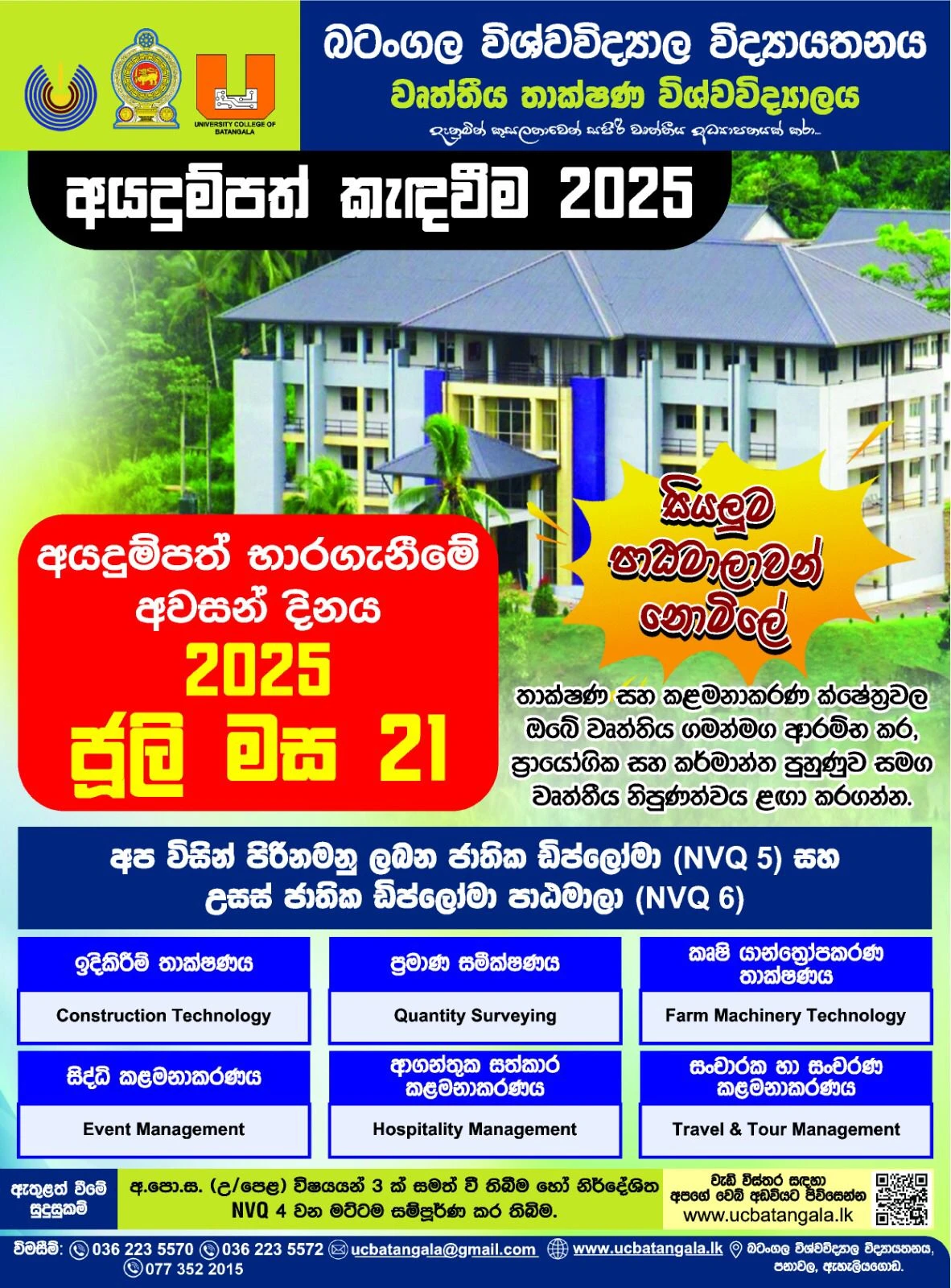 වෘත්තීය තාක්ෂණ විශ්වවිද්යාලය යටතේ ක්රියාත්මක වන බටංගල විශ්වවිද්යාල විද්යායතනය 2025 වර්ෂය සඳහා අයදුම්පත් කැඳවීම මේ වන විට ආරම්භ කොට ඇත…