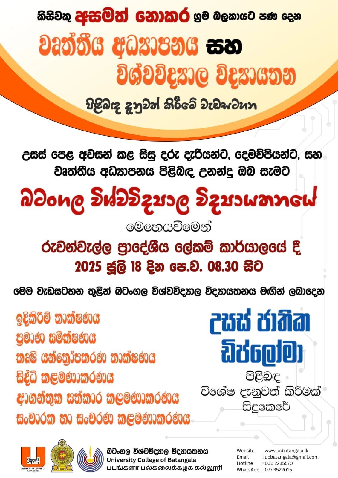 We are pleased to invite you to an awareness session on Vocational Education and University Colleges in Sri Lanka, organized by the University College of Batangala, University of Vocational Technology.