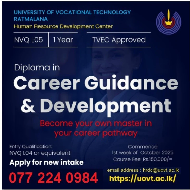 Applications are invited from Sri Lankan citizens who are interested in helping others develop their careers to join this opportunity. The University of Vocational Technology is calling for applications for the Career Guidance and Development Program (NVQ Level 5).